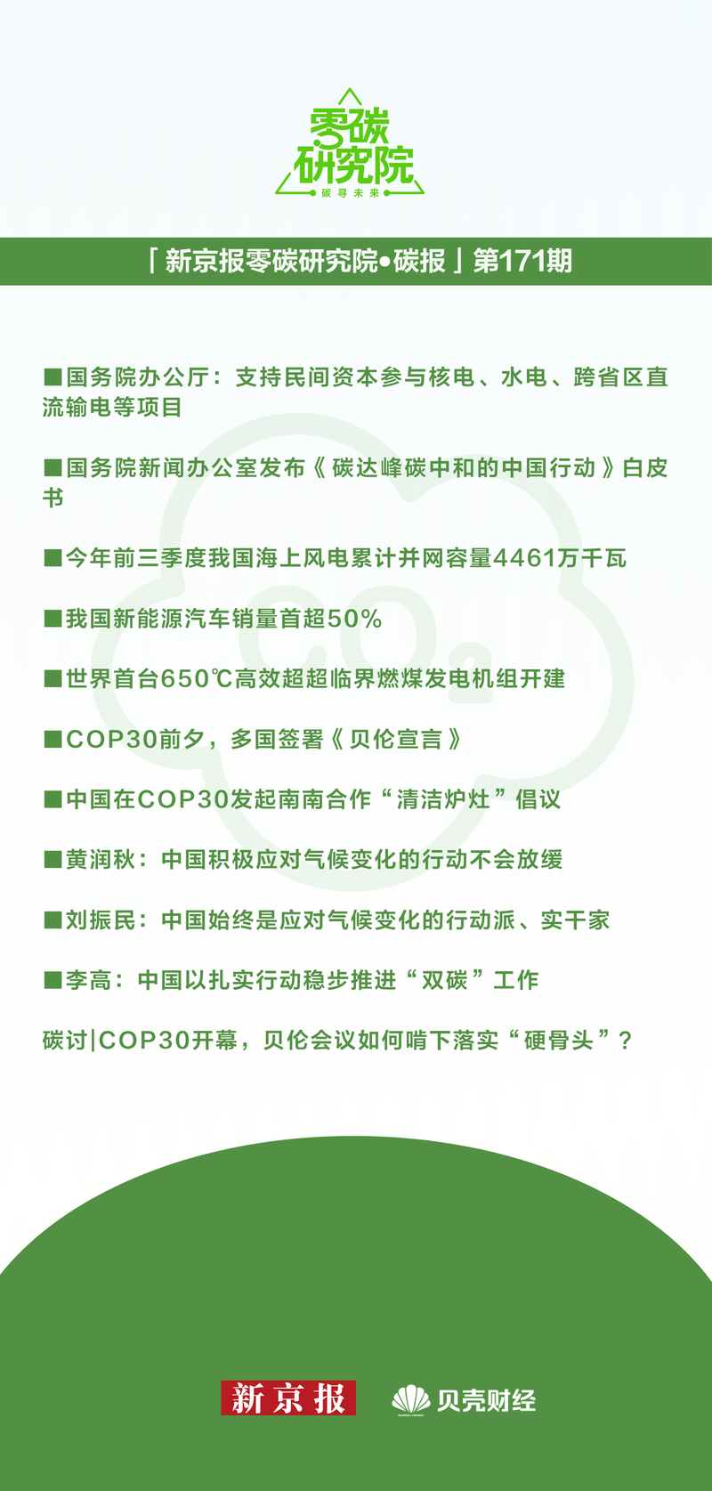 一、双碳动态 一、政策公告 1、国务院总局:支持民间资本参与核电、水电、省际直流输电等项目。近日,国务院办公厅公布了《进一步促进民间投资发展的若干措施》。该文件要求,铁路、核电、水力发电、州际/区域直流输电线路、油气管道、进口液化天然气接收储运设施、供水等须经国家审批(核准)并具有一定效益的项目,应在可行性研究报告(项目申请表)中具体论证和说明私募股权参与的可行性。推动和支持民间资本参与并确定具体项目投资比例根据项目实际情况、民营企业参与意愿及相关政策要求而定。符合条件的项目,民间资本比例可超过10%。零碳解读:这标志着传统上由国有资本主导的重点能源领域正式向民间资本“敞开大门”,从“可以参与”走向“必须参与”,政策的刚性和可操作性显着加强。 2、国务院报业网发表《中国实现最大限度碳中和的行动》白皮书。 11月8日,国务院新闻办发布《中国实现最大限度碳中和的行动》白皮书。白皮书指出,中方始终信守诺言,也确实兑现了。中国达到碳达峰、宣布碳中和的五年来,牢固树立并践行清洁能源理念。泰尔和郁郁葱葱的山脉是宝贵的财富。我们采取有力行动、做出重大努力,加快推进绿色低碳转型,取得历史性成果。构建了全球最系统、最全面的碳减排政策体系,建成了全球规模最大、发展最快的可再生能源体系,形成了全球规模最大、最完整的新能源产业链,实现了全球规模最大、速度最快的新能源汽车推广应用,贡献了全球约四分之一的新鲜绿地面积,成为全球能源强度下降最快的国家之一。探索了发展中国家绿色低碳发展的有效路径,为应对全球气候变化、实现人类可持续发展作出了重要贡献。零碳解读:新碳达峰是中国承担大国责任的努力推动构建人类命运共同体。面对气候变化挑战,人类拥有共同的未来。推动碳峰值和碳中和,意味着中国作为世界上最大的发展中国家,将在世界历史上最短的时间内完成全球最大规模的碳排放强度削减,实现碳峰值迈向碳中和的目标,但这需要付出艰巨的努力。这是多边主义的实践典范,彰显了中国共同建设清洁美丽世界的坚定决心。二、行业趋势 3、今年前三季度,我国海上风电累计并网容量达到4461万千瓦,连续四年位居全球第一。零碳解读:海上风电行业目前正在全国培育30家新型专业化“小巨人”企业。这些公司分为风电机组轴承、海底电缆、监测传感器等。解决碎片化技术问题的核心是深入现场调查。 4、我国新能源汽车销量首次突破50%。中国汽车工业协会11月11日发布的最新数据显示,今年1-10月,我国新能源汽车产销量持续实现高增长。 10月份,新能源汽车月销量占新车销量的比重首次突破50%。零碳解读:今年中国新能源汽车产业呈现高增长。中国汽车工业协会副秘书长陈士华在联络会上解释了原因:另一方面,新能源汽车购置税计划在2026年减半,部分消费者倾向于提前购车。 5.世界冷杉的建设ST 650℃高效超超临界燃煤发电装置开工。 11月8日,全球首台650℃高效超超临界燃煤发电机组华能玉环电厂四期工程完成首次混凝土浇筑,进入全面施工阶段。作为国家重大科技项目,该机组采用中国华能研发的具有自主知识产权的我国新型高温合金材料,实现了主要高温材料技术的完全自主控制,突破了传统燃煤发电的热效率瓶颈,实现了“少实现”以少煤多发电。 650℃高效超超临界燃煤发电机,较常规机型提高发电效率约4个百分点,单位电煤耗降低每年减少约10%,减少二氧化碳排放约45万吨。 零碳:项目建成后,650℃高效超超临界燃煤发电机组将刷新全球火电机组最高参数、最低煤耗新纪录,大幅提升燃煤发电清洁高效利用水平,同时推动国内高端装备制造能力全面提升,为是我国能源安全和实现“双碳”目标的重要支撑。 C.COP30 六区。COP30前夕,多国签署《贝伦宣言》。当地时间11月7日,COP30开幕前夕,在巴西贝伦举行的贝伦气候峰会落下帷幕。中国和欧盟等40多个国家共同签署了关于饥饿、贫困和贫困问题的历史性文件《贝伦宣言》。以人为本的气候。行动.この宣言は、気候変动の影响における着しい最も弱いにある人々の保护を世界的な気候変动対策の中心に据えることを目的としています。零碳解读:《贝伦宣言》呼吁“根本性改变”,承诺将解决气候变化影响分配不均问题作为气候行动的核心目标,符合《联合国气候变化框架公约》充分考虑发展中国家特殊需求和国情的原则。行を达成し、十分な食料や社会保障などの人権を段阶的に実现するのに役立つと强调している。七、中方在COP30上发起“清洁炉灶”南南合作倡议。当地时间11月10日,在COP30中国角气候变化南南合作高层论坛上,中国生态环境部副部长李高宣布了“清洁炉灶”倡议。 “清洁炉灶”气候变化南南合作倡议。生态环境を保护するのを支持することを目的としています。零碳诠释:初步计算表明“清洁”“一灶”旗舰项目预计将惠及相关发展中国家近百万人口,帮助相关国家减少约100万吨二氧化碳当量排放,近万人因雾霾和室内污染过早死亡,约30万公顷森林免遭砍伐。8、黄润秋:中国积极应对气候变化的力度将持续不减。当地时间11月10日,首届COP30中国角举行“生态文明与美丽中国的实践”边会在巴西贝伦举行,生态环境部部长黄润秋在边会上向国际社